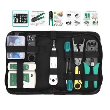 An affordable kit for students. Includes cabling tools for Coaxial and Ethernet (UTP/STP), including a cable tester and punch-down tool.